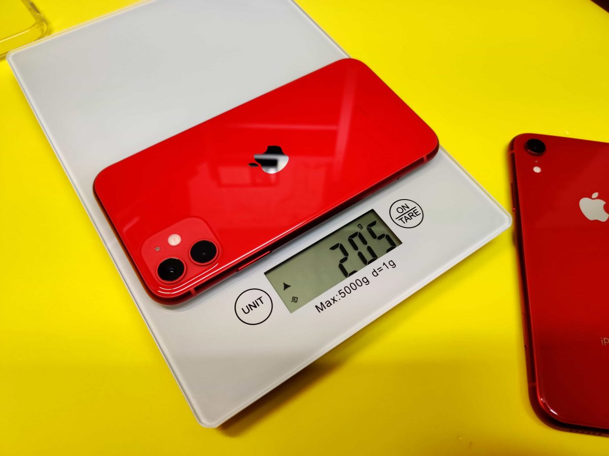 iPhone 11 與 iPhone XR 外型上雖然多了一顆鏡頭,但其重量也沒有因為改變而有所提升。兩者測量時皆為裸機狀態並貼上同一款保護貼,測量出來的結果均為 205 克。並且側邊邊框設計保持與過去一樣的設計,按鍵位置也相同,皆為鋁合金材質。