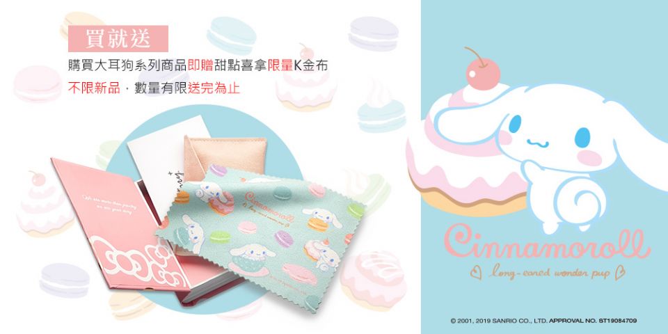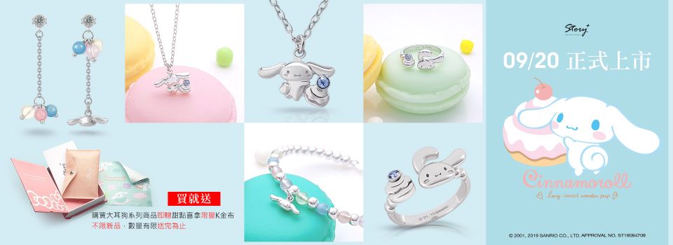 「Cinnamoroll甜點系列」飾品將於9/20於各大通路全面上市,售價自1680元起,還有送限量大耳狗K金布,大耳狗控還在等什麼,K金布數量有限,送完為止,沒拿到的話可是一大損失啊~快去把大耳狗新系列飾品跟超值得收藏的大耳狗K金布一起帶回家吧!
