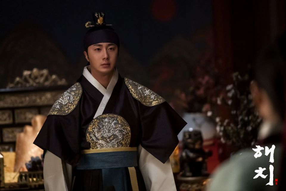 這部的背景是新羅時代,比高麗、朝鮮還要再更早,不得不說,朴炯植登基這套衣服很好看呢!黑白金,內裡還搭配紅色,明明都是很搶眼的色系,但全部放在一起卻意外順眼。