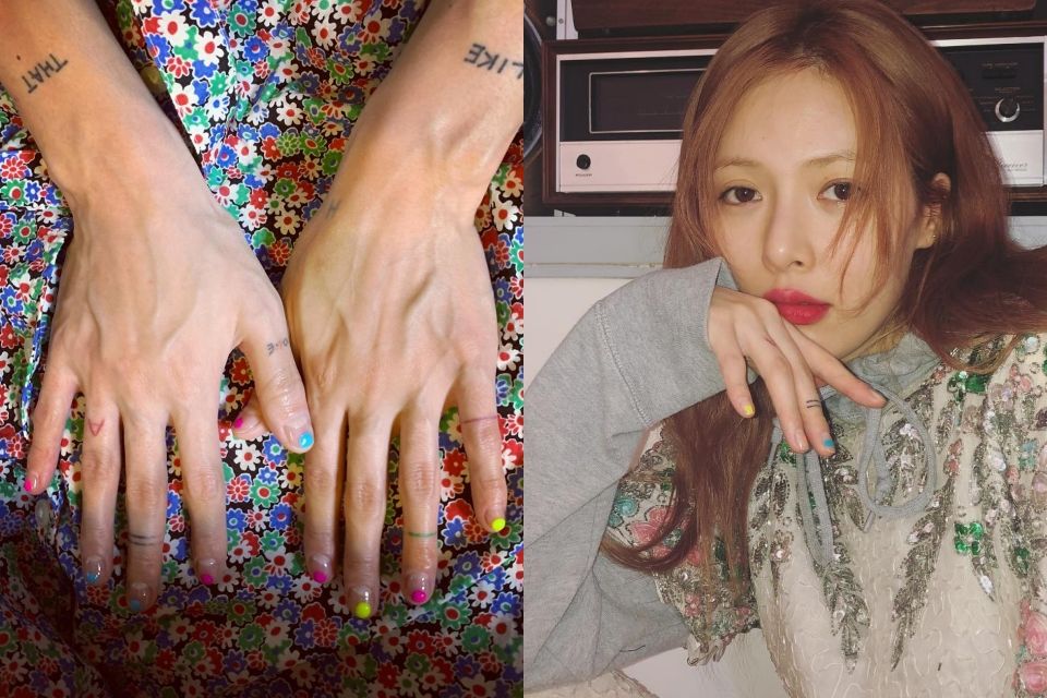泫雅的美甲之前就引發過話題,最常見的就是這種挑指的風格,配色也都很鮮豔明亮,有種活潑的感覺。