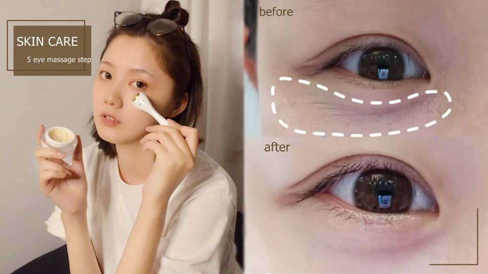 首先取適量眼霜點在眼睛周圍(會長肉芽的女孩可改用精華代替!),用中指+無名指指腹或大拇指指節,由內而外順著眼周生長方向按摩,並延伸至太陽穴,停留3秒後再放開,這樣才不會造成肌膚直接回彈,眼周反而會鬆弛!這一步可以直接提拉眼周肌膚、緊實細紋~
