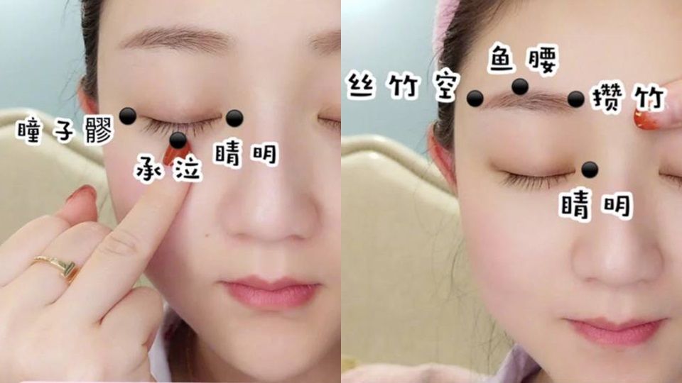 先按壓位於眼頭的睛明穴,臥蠶下方的承泣穴、眼尾的瞳子髎穴~這一組動作重複做三次,不只可以恢復眼周血液循環,還能讓充血的眼睛可以恢復明亮!做完後再回到精明穴,並接著往上眼周按壓~依序按摩眉頭處的攢竹穴、眉中的魚腰穴和眉尾的絲竹空穴,可以預防近視、青光眼,甚至減緩因眼睛疲勞造成的頭痛症狀~