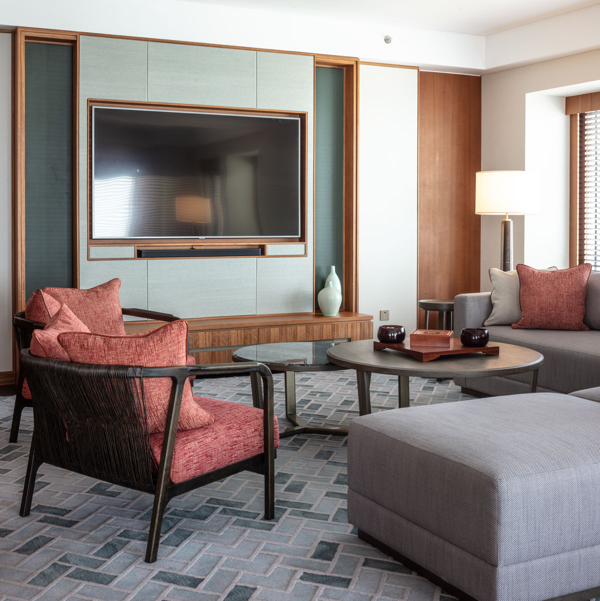 酒店的25間套房亦被LTW重新設計,套房內的多功能空間可供社交娛樂或私人商務會議之用途,同時亦營造出溫馨靜謐的歇息空間。行政套房的佈置精美而且細緻,寬敞的起居室配有灰色沙發,配襯著淺棕色及灰色不對稱條紋的地毯。佈局類似四合院的行政套房特別為商務旅客所設,獨立的起居室、主臥室與寬敞的工作區,為旅客打造舒適的落腳點。套房之大更可容納八人長餐桌,仿效中式庭園的用餐區,以玻璃桃花心木餐桌,搭配舒適的皮革坐椅,同時以中式屏風為靈感佈置牆壁。