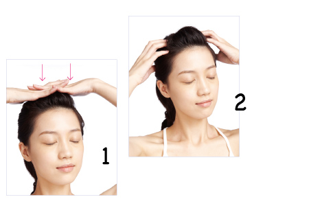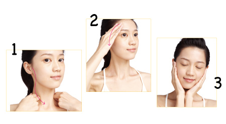 STEP2:指腹沾取適量美容油或日霜,從太陽穴往下滑推至耳下,約5~10次。