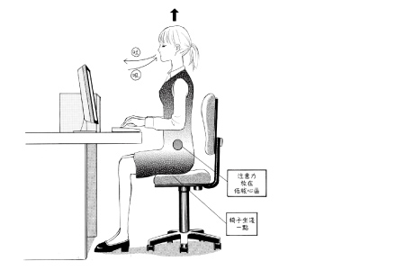 現代人經常使用電腦,身體容易往前傾。此時最好椅子坐淺一點,立起薦骨,想像頭頂往天花板伸展,維持正確姿勢。將注意力放在低核心區,從事深而長的腹式呼吸。(資料來源:《驚人的呼吸保養術!》方智出版社)
