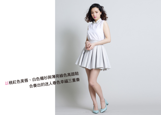 不是只有甜美可愛、也不是只有優雅知性,這個造型的特徵就是巧妙混搭兩種不同風格。成功關鍵就在於避開太過孩子氣的服裝款式。〈snidel白色水鑽鑲飾襯衫價格店洽、Lily Brown 灰藕色蓬蓬裙NT4000、薄荷綠色高跟鞋 價格店洽〉