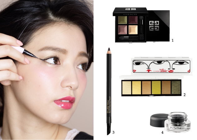 眼彩是走大片暈染的淡淡墨綠色色澤,再搭配眼線筆描繪有點上揚的眼尾線條,並且不需刻意連接下眼線,下眼妝是用眼影來帶一點深邃度就好。