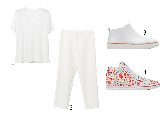 A.全白的平底懶人鞋、版型好看的白T、白色的寬鬆西裝褲、色彩豐富的球鞋
