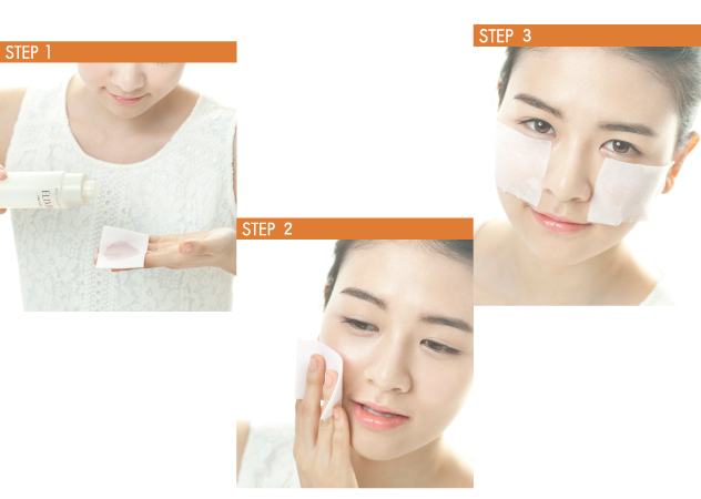 步驟3於兩頰濕敷完後,再用同一片化妝棉依由內而外、由下而上的方向輕輕擦拭全臉。因為是順著肌膚的紋理輕輕塗抹,才不會導致因為動作太粗魯而拉扯到臉部肌膚。