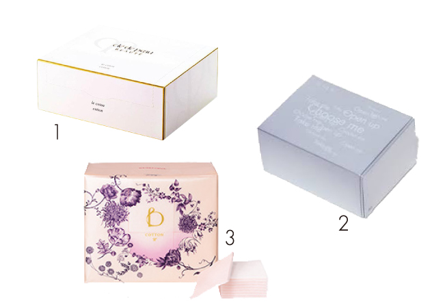 1.肌膚之鑰 絲柔化妝棉 120枚×2盒NT800 能將保養品成分徹底的滲透滋潤到肌膚的深層、是養成光芒美肌的含有真絲成份的化妝棉。2.RMK 化妝棉72枚NT210 膚觸佳手感柔軟的按摩、擦拭專用化妝棉。原色面浸含水分後會轉變成凝膠狀,可在肌膚表面光滑滑動;網眼面的柔軟網狀素材則是能溫和擦拭老廢角質的雙面構造化妝棉。3.SHISEIDO專門店 碧麗妃溫°C循環美肌化粧棉204枚NT300 如羽毛般蓬鬆柔軟的肌膚觸感。白色與粉紅色雙面設計,不掉毛絮纖維不殘留肌膚、能舒適地進行護膚。