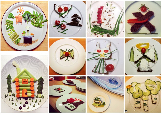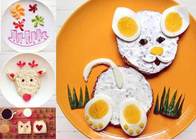 女網友用鬆餅搭配草莓,變成一隻討人喜歡的大象,運用各種不同的蔬菜,拼湊成小廚師,甚至讓雞蛋與餅乾結合,變成一隻楚楚可憐的貓咪。