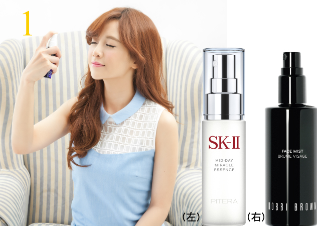 睡前及妝前一定要讓肌膚吸飽水分,在妝前使用清爽精華液後,再選用可防汗防油及含控油成分的無色妝前乳,幫底妝第一層做好把關。接著只要再使用粉餅上妝即可,妝感薄透不厚重則不易溶妝,出油流汗時,將油汗用面紙吸掉後妝感還在,這時也只要小補一下瑕疵部位即可。