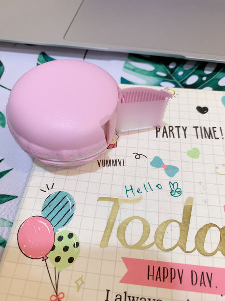 再把膠帶拉開穿過較細的孔,並合上兩片馬卡龍,一個少女系膠帶台就出現啦!
