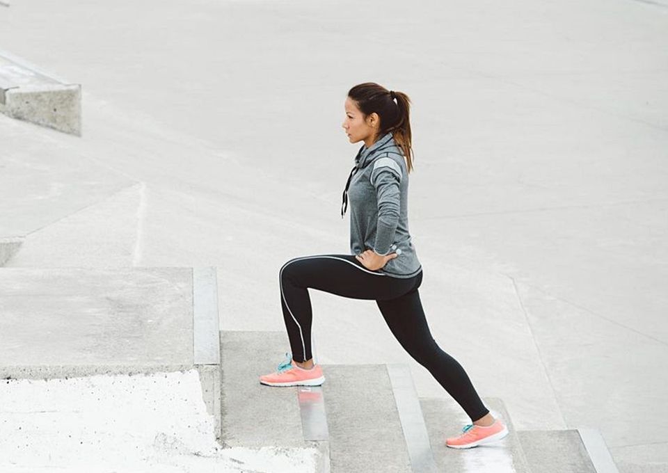 找一個階梯或椅子,將一隻腳往前伸並踩下去,後腳順勢向後伸展,這個動作可以伸展到屁股下方、大腿根部的肌肉,一次可以維持30秒-1分鐘,不要忘記換邊再重複一次同樣動作喔!