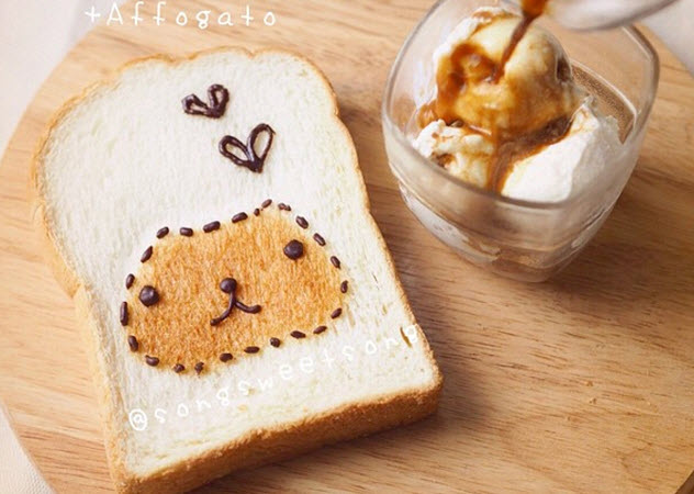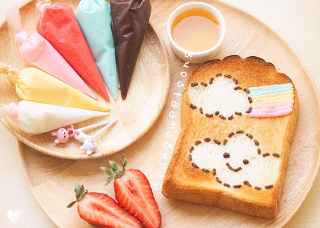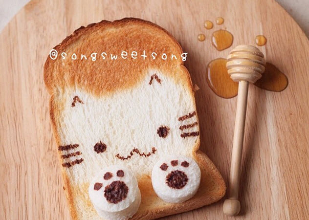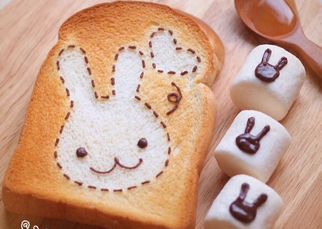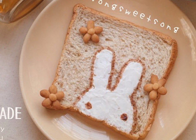 其實就是把自己喜歡的卡通人物描在鋁箔紙上然後挖空,放在吐司上面拿去烤,挖空的部分就會呈現金黃色,然後在用巧克力醬裝飾眼睛、鼻子、嘴巴等五官,就完成卡通烤土司囉~是不是很簡單啊?女孩們不妨自己動手做做看,增添吃吐司當早餐的趣味。