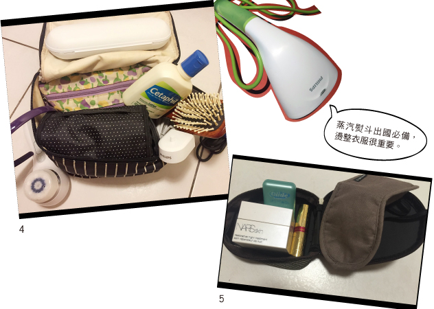 出國私人化妝包,精簡是重點,有護唇膏、保養品、洗臉儀、電動牙刷、髮箍、眼罩、平板夾等,當然蒸汽熨斗也是出國必備,因為燙整衣服是很重要的!