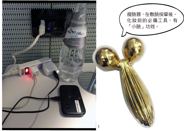 左:瘦臉器,在敷臉按摩後、化妝前的必備工具,有"小臉"功效。