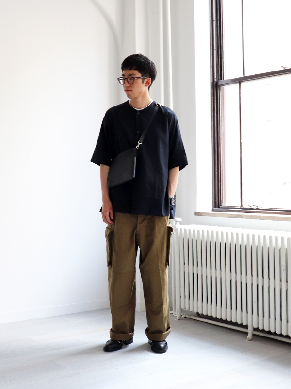 如同先前提過的襯衫搭配,寬鬆軍褲的休閒質感也相當適合搭配短袖襯衫。藉由上身的格紋圖騰和素面下身呈現服裝對比,讓穿搭更富有層次及色彩。而短袖襯衫一向有著夏季活力的美好印象,若選擇開襟款式不妨再以草帽作為配件讓整體休閒風格更加完整。
