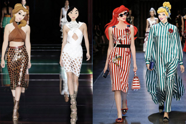 知名品牌Dolce&Gabbana 2016春夏大秀上就出現灰姑娘、白雪公主、美人魚等Disney人物的臉孔,有趣的是Gregory Masouras這樣調換竟然一點違和感都沒有,這些穿上時裝的卡通人物仿佛就生活在你我身邊,就如同下圖!