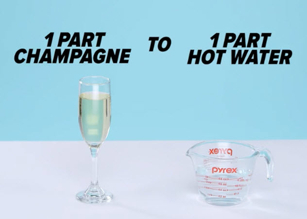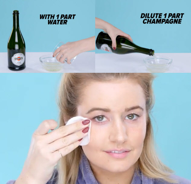 以1:2的比列將香檳與水混合在起,拿起粉撲沾取並塗抹在臉上,可以當妝前乳使用校正你的膚色,是不是很神奇啊?!