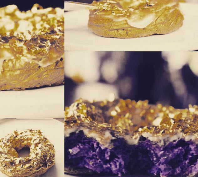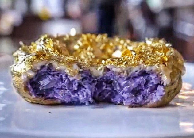 大家快來猜猜黃金香檳甜甜圈一個要價多少呢?答案就是新台幣3300元,這樣的天價可不是一般消費者吃得起啊!!!餐廳的甜點師傅德拉克魯茲,用故鄉普遍的紫色蕃薯當甜甜圈主要材料,外皮則是覆蓋水晶香檳的濃郁糖霜,糖霜選用的是高級路易侯德爾水晶香檳,一瓶要價上萬元台幣,內陷部分則是獨家招牌慕斯與香檳果凍,最外層在灑上滿滿的24K金箔,甜甜圈就成了餐桌上唯一的焦點!