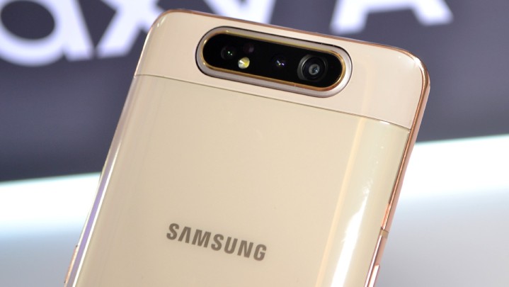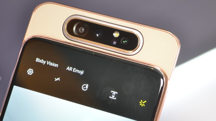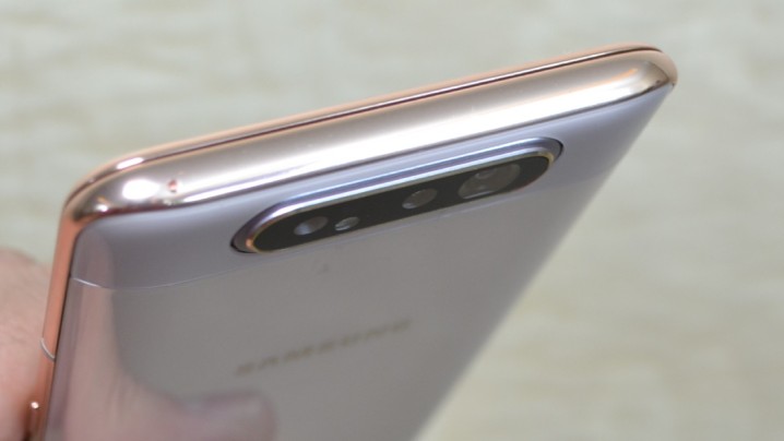 三星 Galaxy A80 是一部讓人眼睛一亮的手機,它在規格部分,主要採用一個三鏡頭相機,以一個 4800 萬畫素 F2.0 標準鏡頭,搭配一個 123 度超廣角 800 萬畫素 F2.2 光圈鏡頭以及一個 ToF 景深鏡頭所組成;而它特別的地方就是採用「翻轉鏡頭」設計,主相機可 180 度旋轉,直接變成前相機,所以不論拍人或是自拍,都有一樣的畫素以及功能。