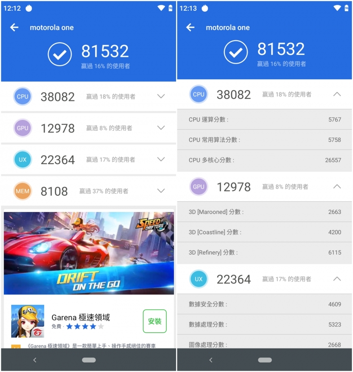 雖然效能取向在中階不過也不免俗的來看看各家跑分軟體的分數表現參考看看吧,安兔兔總分在81532。