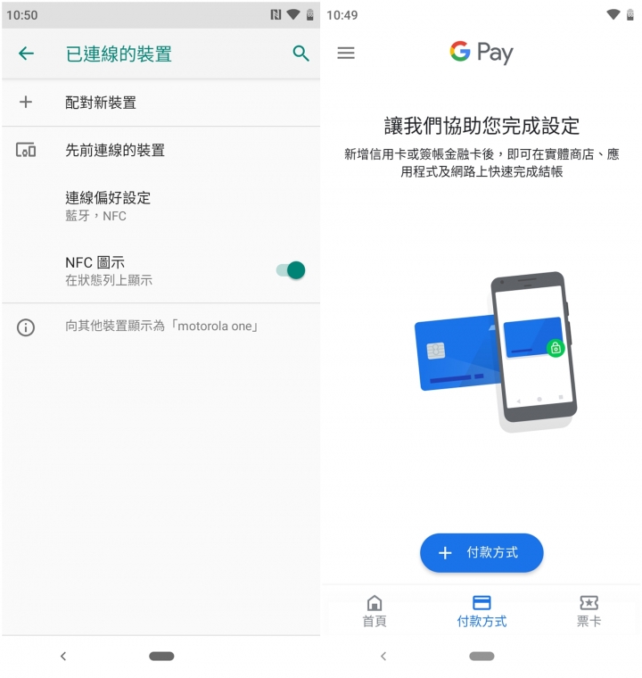 提供NFC功能,就代表Moto One他能提供電子支付的功能,連帶在更新之後直接就有Google Pay的APP可供使用,另外NFC也可以跟另外有NFC的手機來進行傳送資料或是跟支援NFC的裝置來配對。