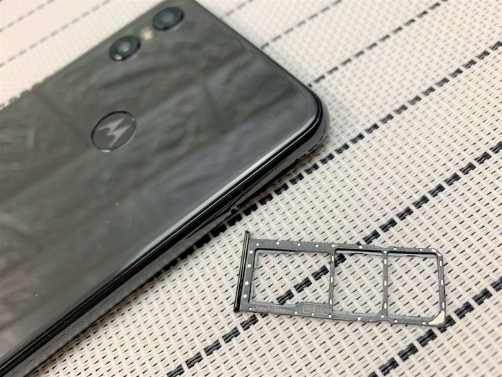 實際來看一下Moto One 實機,螢幕採用5.9吋螢幕解析度則是HD+720x1520LTPS IPS PPI面板、Max Vision19:9長寬比,覆蓋2.5D康寧大猩猩高強度玻璃,黑色系的機身看來就是漂亮。