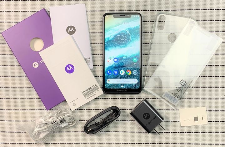 開盒後就可以看到Moto One躺在盒中了,比較特別的是有預搭了一個透明的手機殼在機身上直接就幫你保護好手機,這點在不少家手機大商都開始有附上了說相當實用。