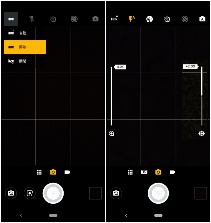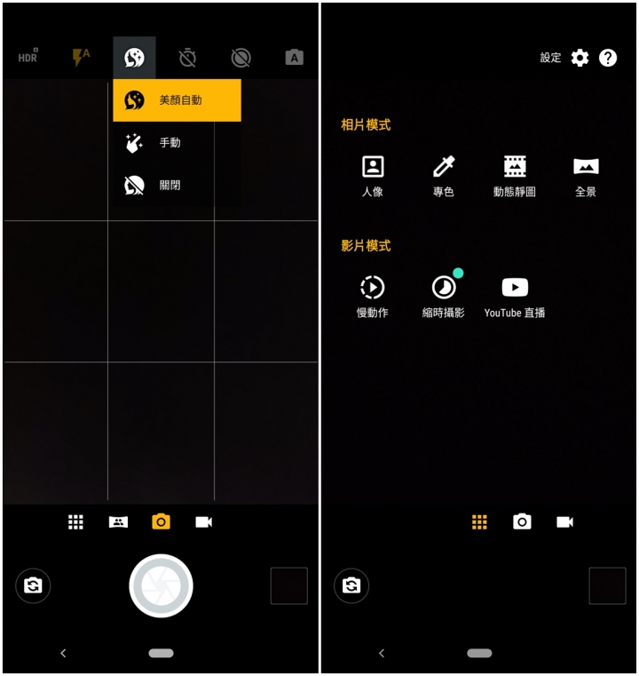 美顏模式:切換到自拍鏡頭可以看到美顏模式分為自動與手動,自動就會自動來修整容貌,而手動則是可以調整七段的手動美顏調整可選擇。