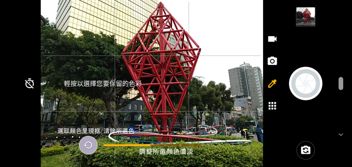 專色:另一個moto one拍攝上好玩的功能,有點類似相機功能裡的單色抽色的方式,以往此一功能大多是指定單一色彩再來拍攝呈現要切換則是另外再選過,而在專色功能上面則是可以自由選定畫面中的任一色彩快速透過點選選擇顏色,也能調整想要在畫面中呈現出的濃淡表現,一旁的顏色框也會呈現當下所選的顏色不喜歡就清除重選即可,也能即時來預覽。
