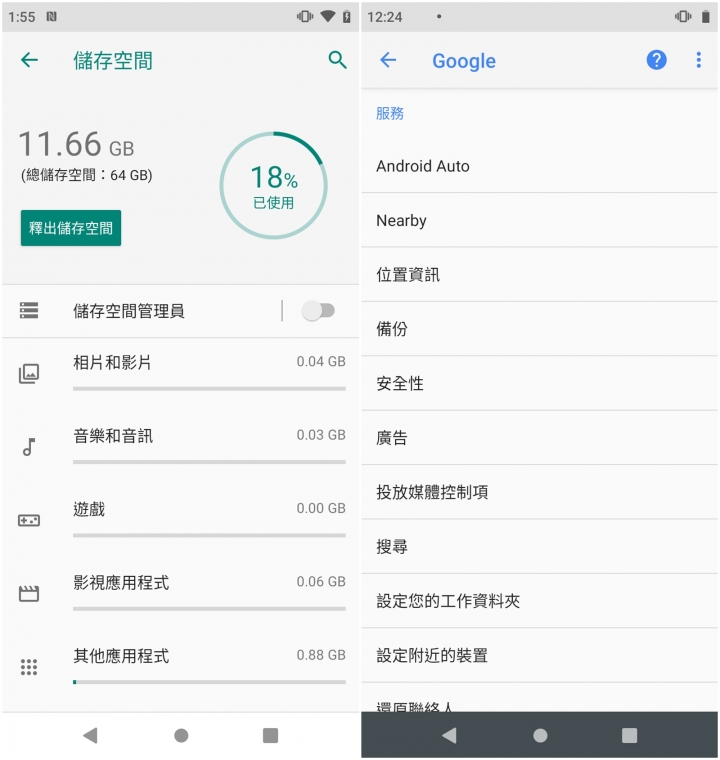 看一下儲存空間內置空間64GB,程式使用上已佔18%,而Google家的系統上針對安全以及更新都是定期在進行更新。