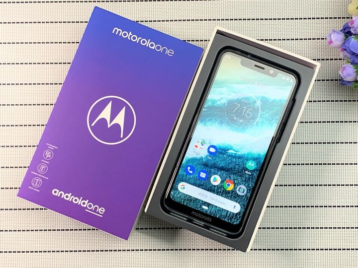 首先來看一下上手開箱的Moto One的外盒包裝採用了紫色的底色配上白體字樣闡明Motorolaone以及Google的Android One系統聯手呈現。