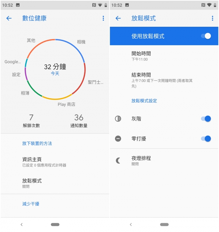 數位健康中可以看到針對使用手機的時間長短以及相關的程式開啟時間,另外放鬆模式這點還蠻實用可以設定螢幕的畫面零打擾的動作,規範避免長時間使用手機。