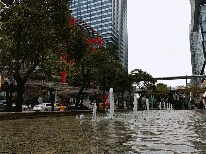 噴水池中的水柱,只單選了一二道水柱動圖的呈現,其他的則被凝結住了。