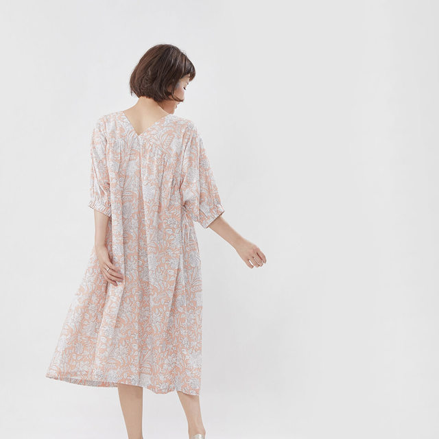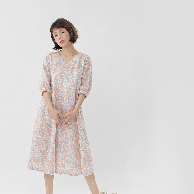 選用寬鬆版型的 V 領長洋裝,一件就能將遮掩住不理想的身形遮部分,是懶惰女生最愛的必著款。結合粉色印花的點綴提升熱情活潑的層次,不論是單穿或混搭腰帶都能呈現優雅十足的女人氣質。