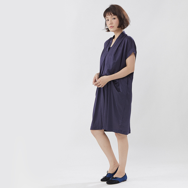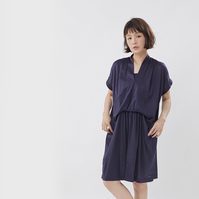 以細版 V 領的口袋洋裝,利用點點印花與抗皺的布料為單品增添幾分率性感受,輕盈舒適材質在夏日著用顯得清爽,加上腰間縮腰處理使穿著時瞬間擁有顯高的造型視覺。