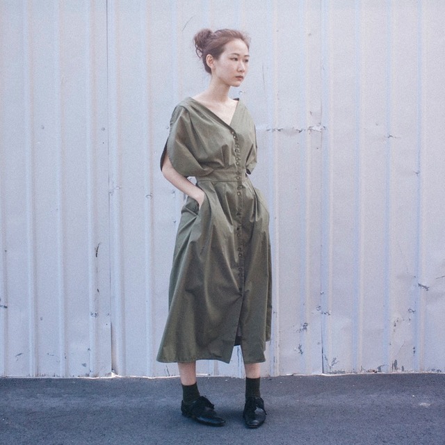 從領口、袖口到背部皆帶有 V 型輪廓設計的洋裝,能將臉型與手臂製造纖細的比例,而露出肩膀與脖子線條,不僅散發微微的性感氣息之外,融入蒼綠色調更加乘一股難忘的成熟品味。