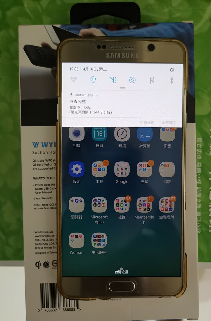 ▲使用SAMSUNG NOTE5,支援三星有線閃電快充,約在12-15W左右功率。可看到手機螢幕顯示出閃電快充充電中。