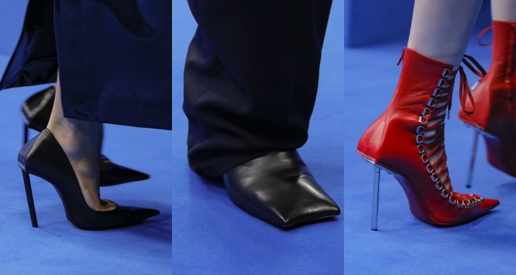 在鞋款的設計中,方型依然是重點,不管是運用方頭作為鞋履的楦頭,還是用方型後腳跟做為設計,擁有幾何形體的方正版型,依然是明年鞋的重點,Balenciaga 將鞋履越做越厚重的特性,在這次的春夏則做了大幅度的調整,宛如慢跑鞋合腳輕盈感的球鞋成為這次秀上唯一的運動鞋款,設計上不變的是品牌用多種拼接的鞋面,讓單一色彩的鞋款依然富有層次。