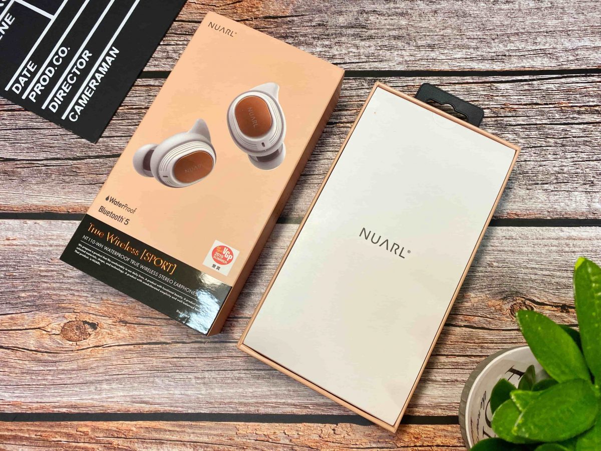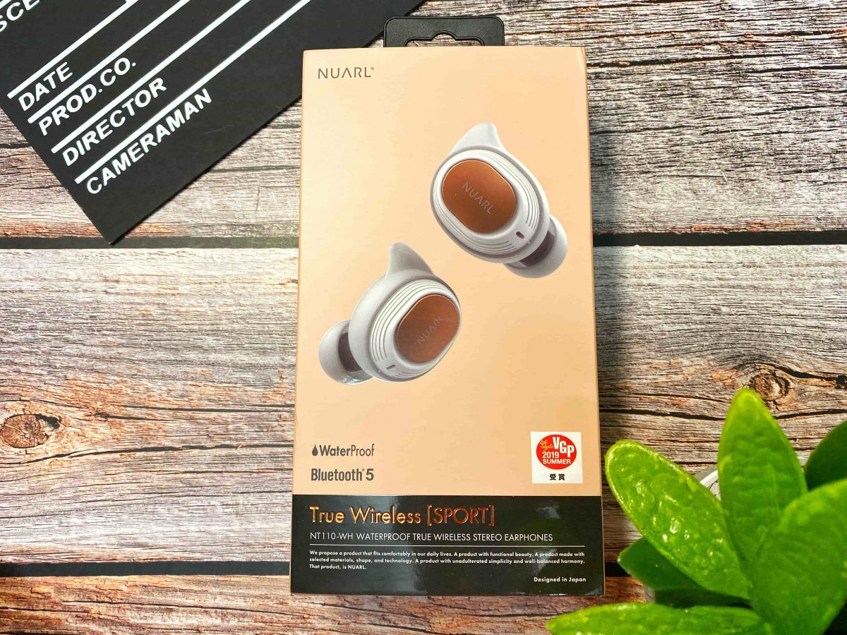 NUARL NT110 包裝採用 NUARL 典型的設計風格,正面大大的耳機本體搭配上下方 2019 VGPSummer 金賞 勳章。從包裝下方鍍金字體( SPORT )可以了解到 NUARL 將這款真無線藍牙耳機定位在運動愛好者,同時為了防止運動過程中遇到淋雨或大汗淋漓的問題,NUARL NT110 支援 IPX7 防水等級。從上圖可以看到包裝中含有的配件包含: