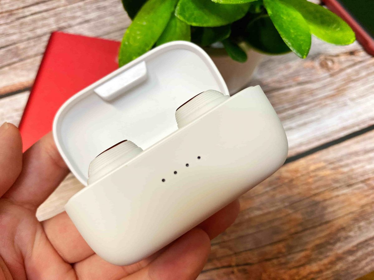 QCC3020 藍牙晶片除了連線更加穩定以外,同時也具備延長使用時間。在功耗較小的 AAC、SBC 傳輸協定下可連續使用 9.5 小時;而在功耗較大的 aptX 傳輸協定下則可連續使用 6 小時。當耳機電量用盡時,透過耳機上的四個端點靠近充電倉的四個針點即可充電,並且從側面的四個LED燈可以初步判斷充電艙的剩餘電量。