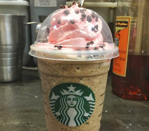 可可脆片星冰樂加上樹莓口味的鮮奶油和一些巧克力碎片做點綴,根本正中女孩們的心啊~如果台灣星巴克有這款星冰樂,小編一定跑第一去嘗鮮。