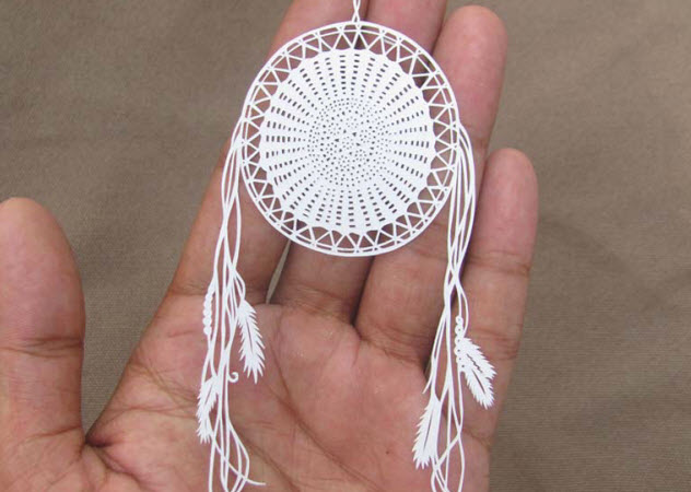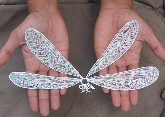 來自印度的 Parth Kothekar,他將自己所擁有的藝術天分全部都在一張白紙上呈現,他不需要太多工具,只需要一支鉛筆、一把雕刻刀和耐心,就可以給予一張白紙生命力,化身成蜻蜓的翅膀、細膩的羽毛,甚至變成女孩最愛的耳環墜子,將剪紙藝術發揮得淋漓盡致。