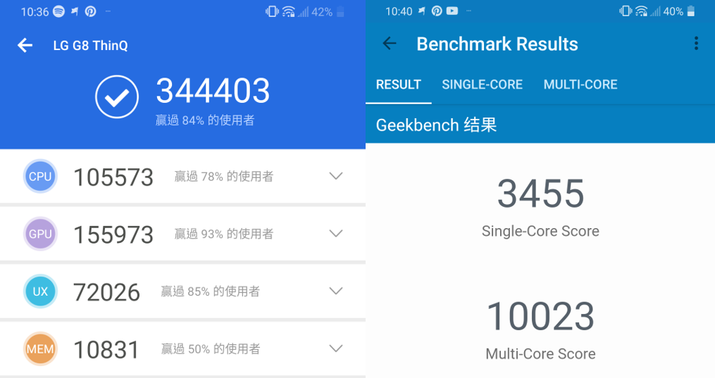 在安兔兔的跑分測試上,總分為 344,403,這邊也附上 CPU、GPU 等測試項目的分數。而在 GeekBench 的跑分測試上,單核的分數則是得到 3,521,多核分數為 10,958。以下的分數僅供參考,還是會依據每台手機而有不同結果唷!