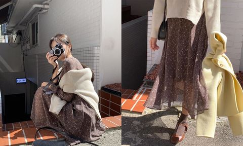 韓國人氣網紅 kimehwa 的 IG 上滿滿都是碎花洋裝的穿搭示範,想知道秋冬該怎麼搭滑滑她的 IG 就沒錯!米色可以說是每年秋冬最受歡迎的顏色了!在淡雅的米色長袖碎花洋裝外搭一件粉嫩色針織外套,視覺上有了層次感,也增添優雅甜美的感覺。