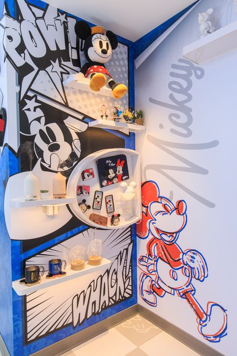 整體設計以1928年最經典原始的米奇、米妮圖樣為主角,特別掛上「米奇店招」與一般門市做區隔,門口柱子上還有與人等高的霓虹燈米奇,呈現美式懷舊復古氛圍。