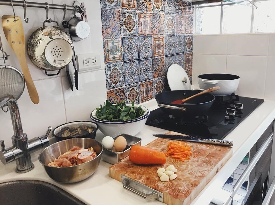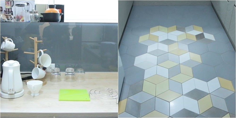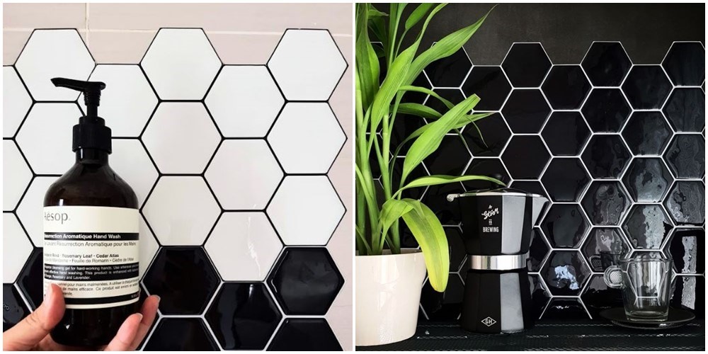 1. 喜歡一致氣氛的你,可延續廚房內地坪的六角磚設計,選用六角磚花磚拼貼,讓幾何造型延伸至牆面。