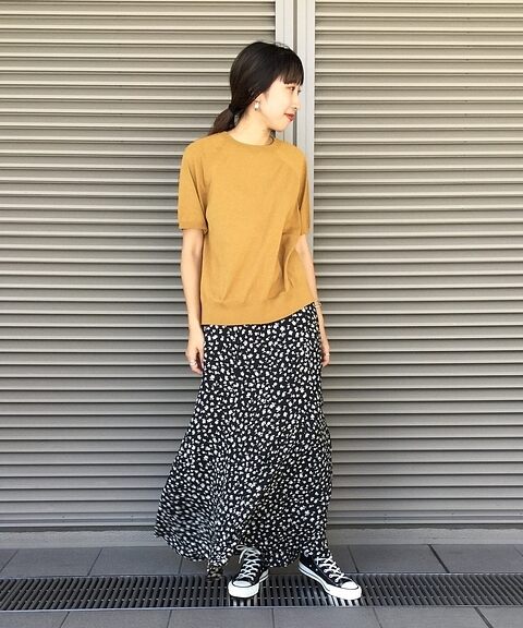 印花的長裙往往給人一股輕淑女的氣質,若想成功混搭出風格印象時,建議可以以棉料 Tee 以及帆布鞋搭配出休閒女孩感。而利用高筒的設計藏起裙下的肌膚線條尤其適合在秋冬時節穿搭。